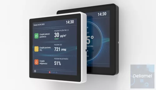 Az előlapon üveg, színes érintőképernyő található, modern és minimalista megjelenéssel. A lekerekített élek és kifinomult részletek könnyed, stílusos megjelenést kölcsönöznek.